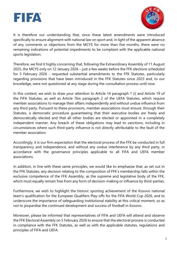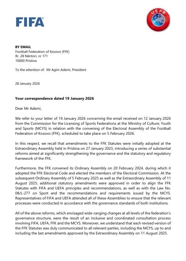Po ashtu, FIFA dhe UEFA konfirmojnë se përfaqësuesit e tyre do të jenë të pranishëm në Kuvendin Zgjedhor të FFK-së më 5 shkurt 2026, për të vëzhguar zhvillimin e procesit në përputhje me Statutin e FFK-së.