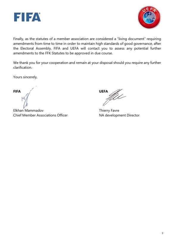 Në një shkresë të përbashkët drejtuar presidentit të FFK-së, Agim Ademi, FIFA dhe UEFA theksojnë se këto ndryshime janë rezultat i një procesi konsultimi gjithëpërfshirës ndërmjet FIFA-s, UEFA-s, FFK-së dhe Ministrisë së Kulturës, Rinisë dhe Sportit, duke rikujtuar se përfaqësues të dy institucioneve kanë qenë të pranishëm në të gjitha Kuvendet e FFK-së ku janë miratuar ndryshimet statutore.