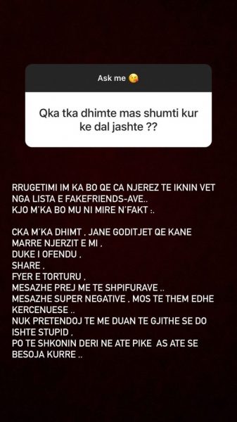 Këtë e ka zbuluar gjatë një bashkëbisedimi me ndjekësit e saj në Instagram, ku njëri prej tyre e ka pyetur për atë që ka përjetuar kur ka dalë jashtë.