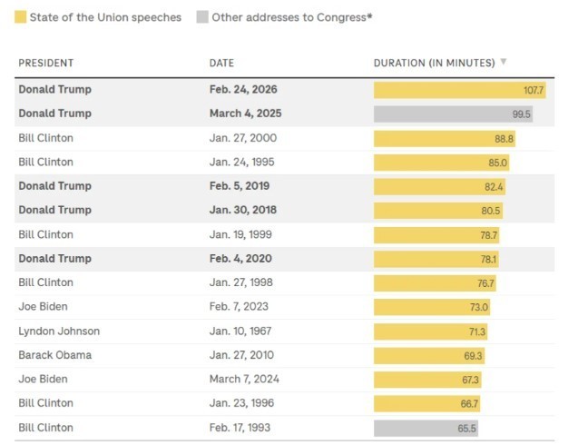 Fjalimi i Trumpit të martën ka zgjatur rreth 1 orë e 48 minuta, duke e bërë atë fjalimin më të gjatë para Kongresit në të paktën 60 vitet e fundit.