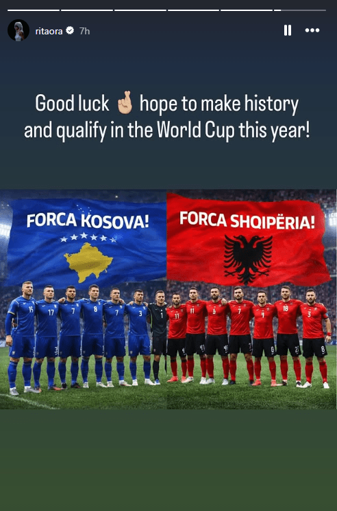 Këngëtarja shqiptare me famë ndërkombëtare, Rita Ora, ka treguar mbështetjen e saj për kombëtaren e Kosovës dhe të Shqipërisë në futboll përmes një postimi në Instagram.