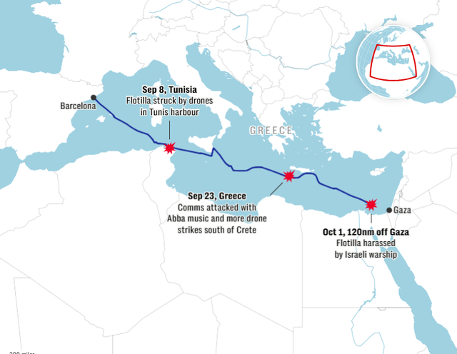 Flota u ndesh me një rreth anijesh luftarake ndërsa po i afrohej Gazës, ku organizatorët raportuan bllokim të sinjalit dhe morën paralajmërime të shumta për të dorëzuar ndihmën e tyre dhe për t’u kthyer.