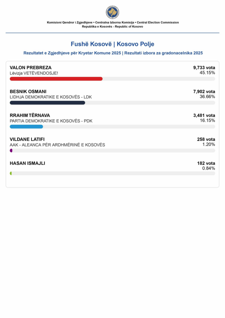 Valon Prebeza i VV’së dhe Besnik Osmani i LDK’së do të shkojnë në balotazh si kandidatë për kryetar të komunës së Fushë Kosovës.
