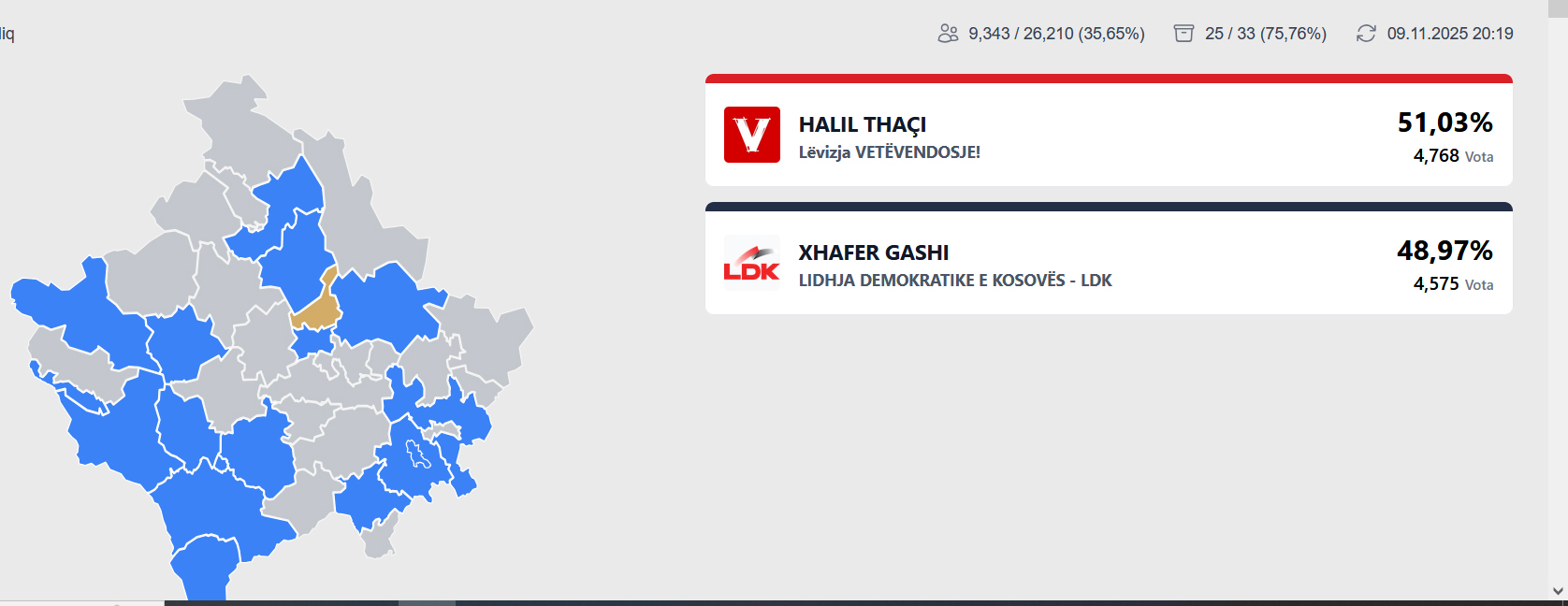 Deri tani, me vota prin Halil Thaçi nga VV-ja me 51,03%, duke lënë pas me një diferencë të vogël Xhafer Gashin e LDK-së, i cili ka 48,97%.