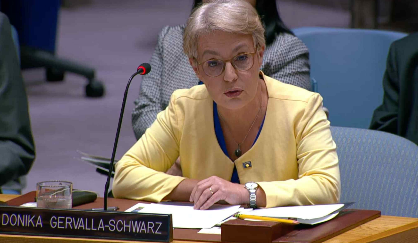 Ministrja në detyrë e Punëve të Jashtme dhe Diasporës, Donika Gërvalla, në fjalën e saj para Këshillit të Sigurimit të Kombeve të Bashkuara, paralajmëroi se Serbia sot përbën një kërcënim real për paqen dhe stabilitetin në rajon, përmes makinerisë propagandistike të mediave të kontrolluara nga regjimi i Vuçiqit, që përhap urrejtje dhe nxit ndasi etnike.
