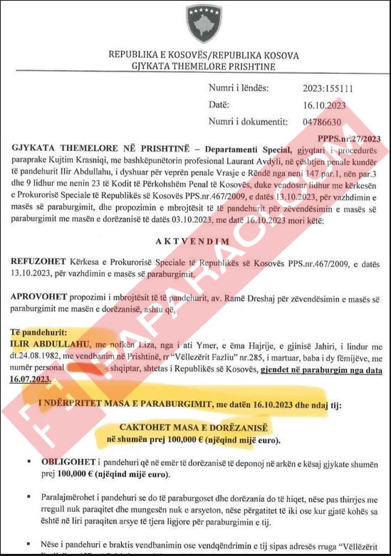 Po ashtu, sipas vendimit të gjykatës që ka siguruar Paparaci, i pandehuri obligohet që në emër të dorëzanisë të deponojë në arkën e kësaj gjykate shumën prej 100 mijë eurove.