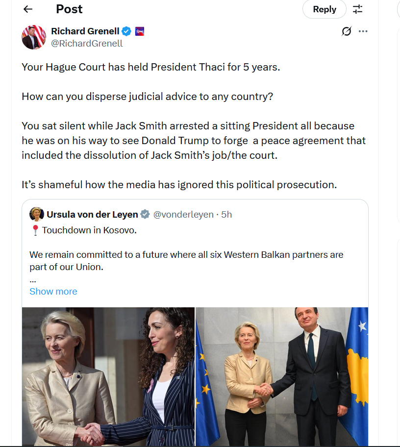 Grenell kritika Von der Leyen: E mbani Presidentin Thaçin 5 vjet në Hagë, si mund të flisni për drejtësi