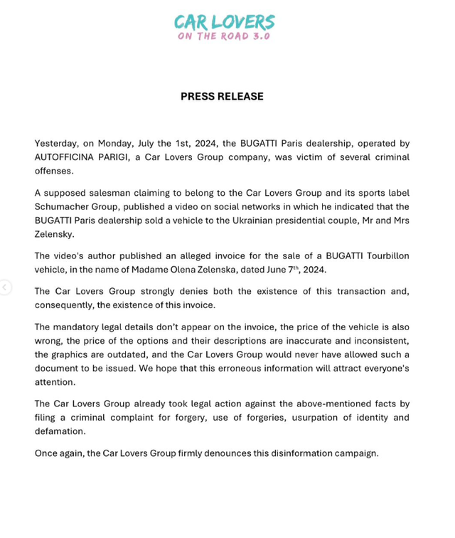 Më pas, lajmi i rremë detyroi edhe kompaninë Bugatti me degë në Paris, ku pretendohej se ishte blerë makina, që të reagonte.