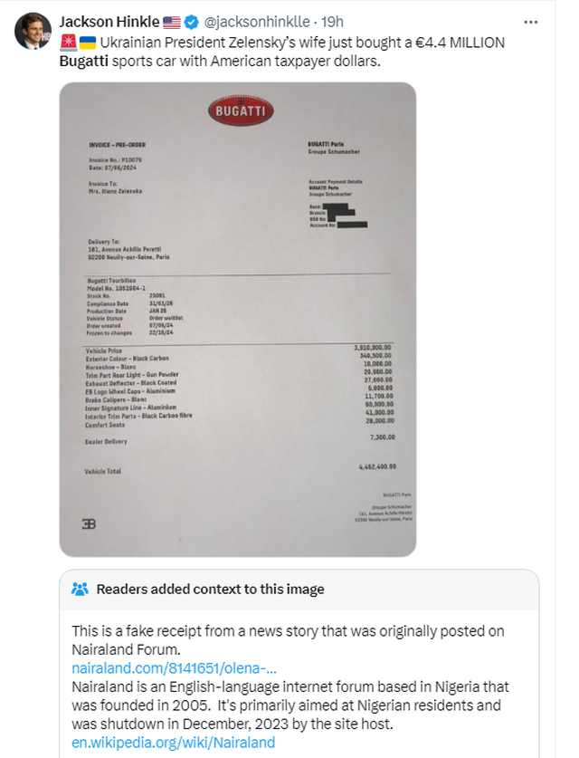 Një lajm i rremë u përhap ditën e djeshme në Twitter (X), ku u publikua një faturë që pretendohej se ishte e blerjes së një makine super-luksoze nga gruaja e presidentit të Ukrainës Volodomyr Zelensky, Olena Zelenska.