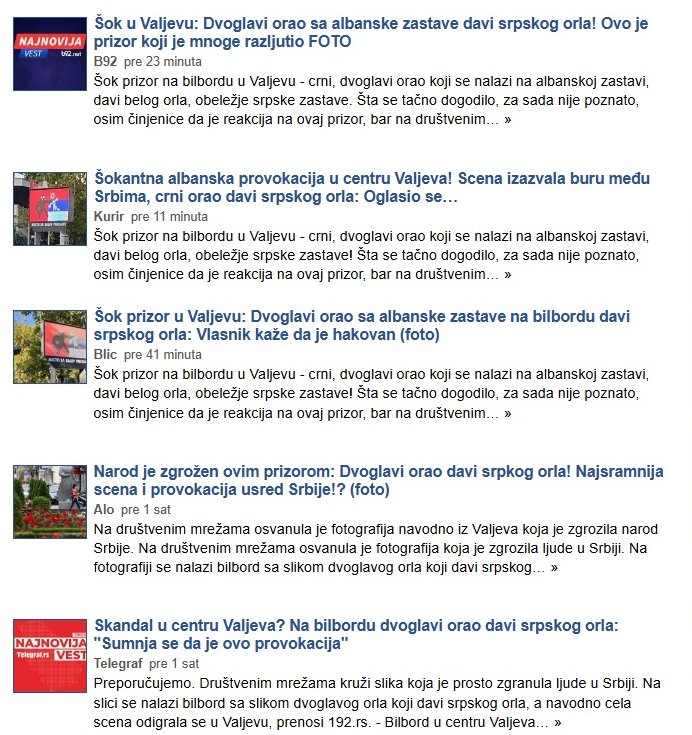 Kjo pasi, siç raporton B92, në një billbord të qytetit të Valevës (Valjevo), Serbi, është shfaqur një imazh i cili paraqet flamurin serb në një çosh dhe në anën tjetër shqiponjën dykrenare shqiptare në prapavijë të kuqe dhe me plisa në kokë, e cila e ka kapur për fyti shqiponjën serbe.
