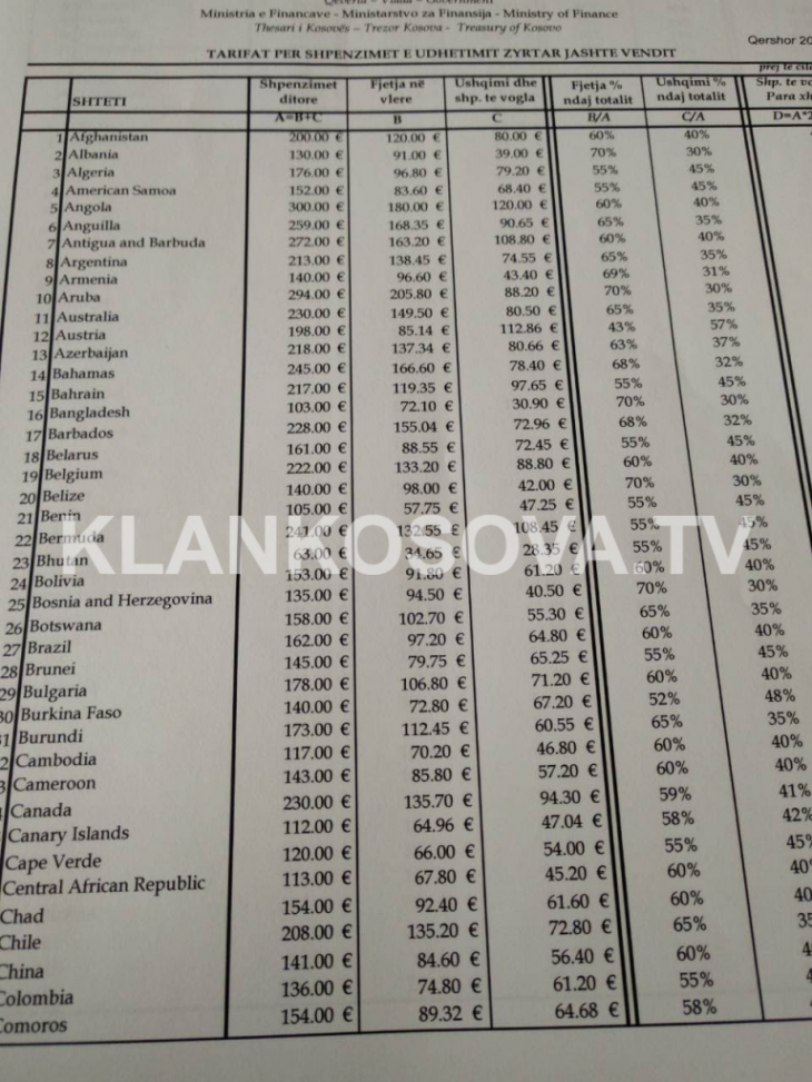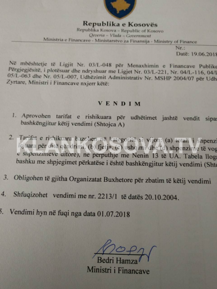 Më poshtë keni dokumentin sipas të cilit përcaktohen tarifat për shpenzimet e udhëtimit zyrtar.