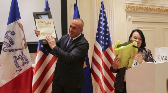 Në këtë ceremoni Kryeministri Haradinaj pranoi edhe Certifikatën e nderit nga dhoma e përfaqësuesve të Iowas për të gjithë kontributin e dhënë në avancimin e raporteve mes Kosovës dhe këtij vendi.