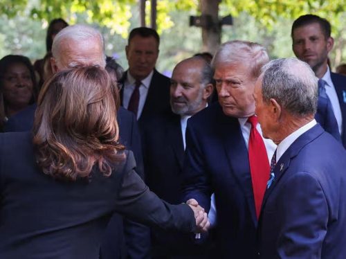 Trumpi mori pjesë në ceremoninë e përvjetorit të sulmeve bashkë me kandidatin republikan për nënpresident të ShBA-së, JD Vance. Trumpi dhe Harrisi i shtrënguan duart me një buzëqeshje të kufizuar para se të hynin në rresht në mënyrë solemne për ceremoni.
