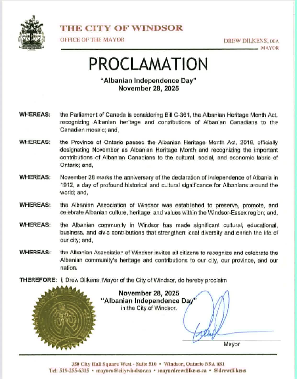Në njoftimin për mediet thuhet se: “Për herë të parë festojmë si komunitet i bashkuar. Ngritja e flamurit, e shoqëruar me himnin shqiptar, do të mbahet në Bashkinë e Windsorit – 350 City Hall Square W, Windsor, ON N9A 6S1, në orën 3 pasdite të datës 28 nëntor, ditë e premte”.