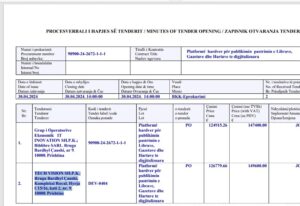 Biblioteka Kombëtare e Kosovës “Pjetër Bogdani” muajin e kaluar ka publikuar procesverbalin e hapjes së tenderit me titull “Platformë hardver për publikimin pastrimin e librave, gazetave dhe hartave të digjitalizuara”. Për këtë titull të kontratës kanë tenderuar dy operatorë ekonomikë, Grup i Operatorëve Ekonomik IT INOVATION SH.P.K.; Biblibre SARL, me lokacion rruga Bardhyl Çaushi, nr. 9, 10000, Prishtinë dhe TECH VISION SH.P.K., me lokacion rr. “Bardhyl Çaushi”, nr. 9, 10000, Prishtinë. Por për këtë aktivitet të prokurimit ka bërë ankesë operatori ekonomik “OE RENER Sh. P. K.”, i cili, në një paragraf të ankesës, duke paraqitur pretendime ankimore, ka shkruar: “AK, me Kërkesa 2 Ofertuesi i shërbimeve duhet të ketë të paktën 3 persona të certifikuar për softuerin e arkives digjitale, duke mos specifikuar llojin e certifikimit dhe angazhimin e të njëjtëve, përbën favorizim te një OE, i cili posedon këtë informatë dhe i posedon personat e certifikuar”. Megjithatë, ankesën e “OE RENER Sh. P. K.” e ka hedhur poshtë autoriteti kontaktues i Bibliotekës Kombëtare të Kosovës, Drilon Kabashi, zëvendësdrejtor i Zyrës së Prokurimit.
