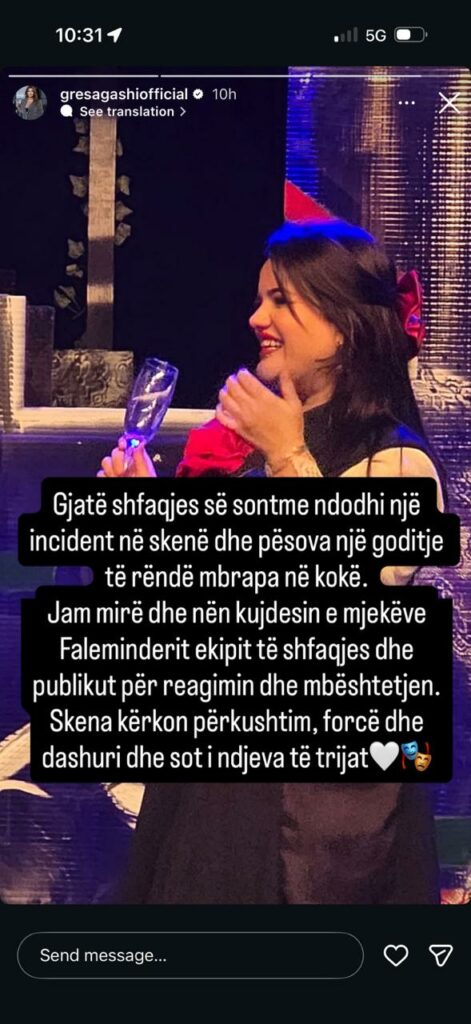Përmes një reagimi në rrjetet sociale, vetë Gresa ka bërë të ditur se ka pësuar një goditje të fortë në pjesën e pasme të kokës. Ajo ka postuar një foto nga shfaqja, duke shpjeguar situatën që ka shkaktuar jo pak shqetësim.