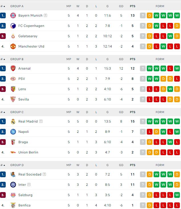 Në grupin B, Arsenali vulos vendin e parë në grupin B, pas suksesit të thellë 6-0 ndaj Lens. Gooners shkojnë në kuotën e 12 pikëve, 4 më shumë se PSV.