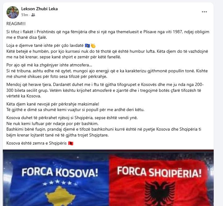 Ai ka kërkuar që të gjitha tifogrupet sportive, si në Kosovë ashtu edhe në Shqipëri, të bashkohen në mbështetje të lojtarëve dhe të krijojnë atmosferë fitoreje kudo që luhet.