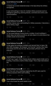 Forcat e Mbrojtjes së Izraelit kanë treguar arsyen e goditjeve të këtyre vendeve me raketa, sipas tyre organizata terroriste ‘Hamas’ i ka kthyer zonat e banuara në Gaza në bastione ushtarake, të cilat janë duke u përdorur për qëllime të shumta ushtarake si mbledhja e inteligjencës, planifikimi i sulmeve, komandimi dhe kontrolli dhe komunikime.