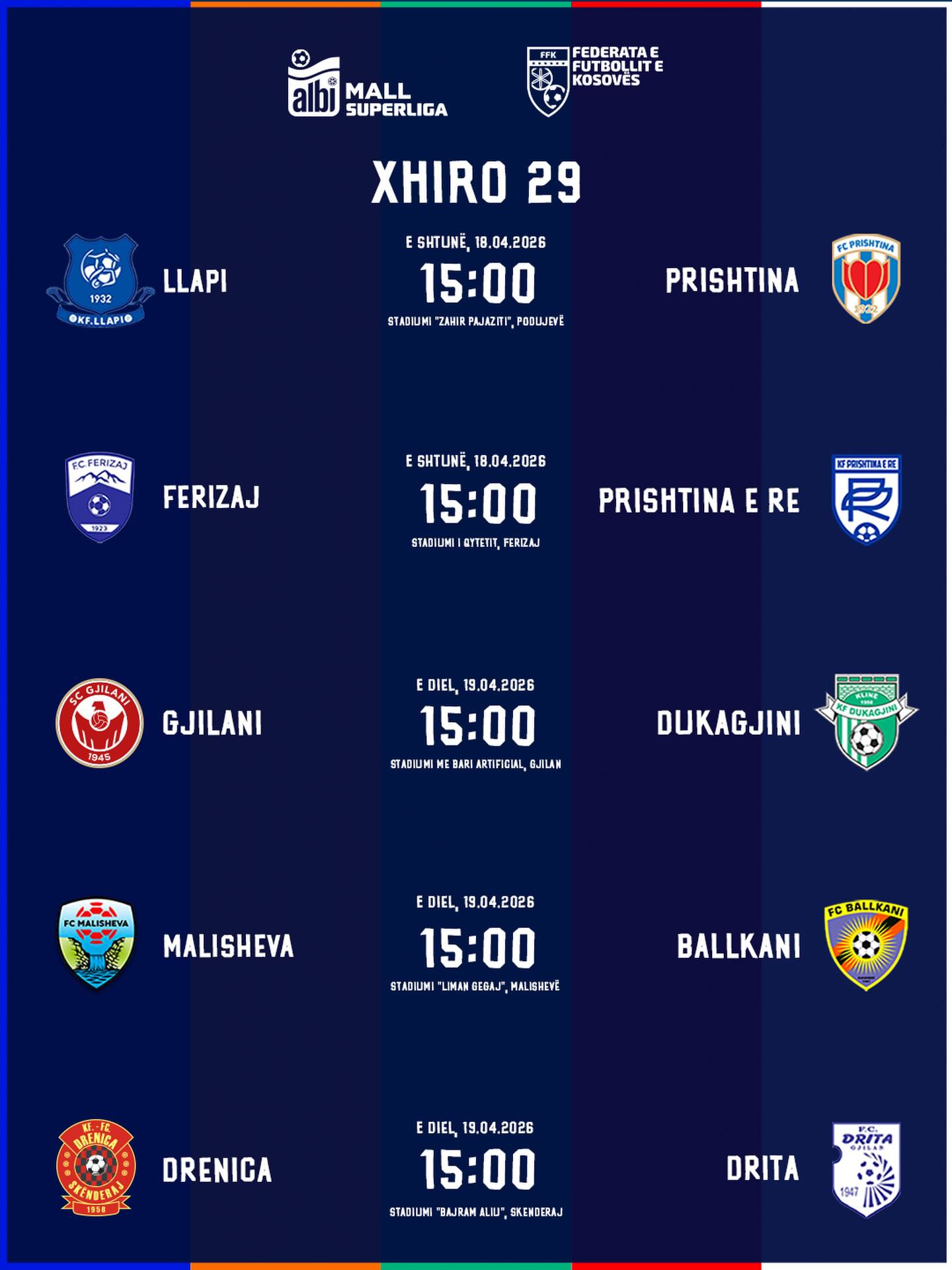 Java e 29-të në Superligën e Kosovës vazhdon edhe sot, me tri ndeshje të cilat premtojnë emocion dhe spektakël.