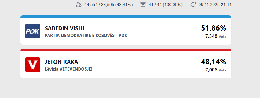 Ndërsa, Jeton Raka nga Lëvizja Vetëvendosje ka fituar 48,14%.