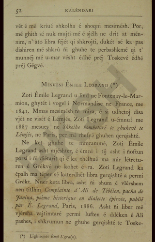 Lagrand publikoi rreth 40 libra në greqisht dhe për historinë e Greqisë. Një ndër ta është edhe libri që i kushtohet Ali Pashë Tepelenës me titull në origjinal: Complainte d’Ali de Tepelen, pasha de Janina, poème historique épirote. Publikuar nga E. Legrand, Paris, 1886. Është një libër me vjersha vajtimtare përmbi luftën dhe vdekjen e Ali Pashës, i shkruar në gjuhën greke, nisur prej një shqiptari muhamedan qyshmoti dhe i mbledhur e i publikuar prej zotit Legrand. Një tjetër libër Généalogie d’Ali Pasha, që është edhe ky një libër me vjersha greqisht përmbi gjyshërit e Ali Pashës, u publikua prej zotit Lagrand. Përveç këtyre dy librave, Lagrand prej dhjetë vitesh po punon për një libër me titull Bibliographie e Albanisë, d.m.th. një libër ku përfshihen të gjithë librat që janë shkruar për shqiptarët e për gjuhën shqipe. Ky është një shërbim i madh që zoti Legrand po i bën dijes së kombit tonë dhe ne e presim me padurim kur të dalë në dritën e botimit kjo punë e madhe.