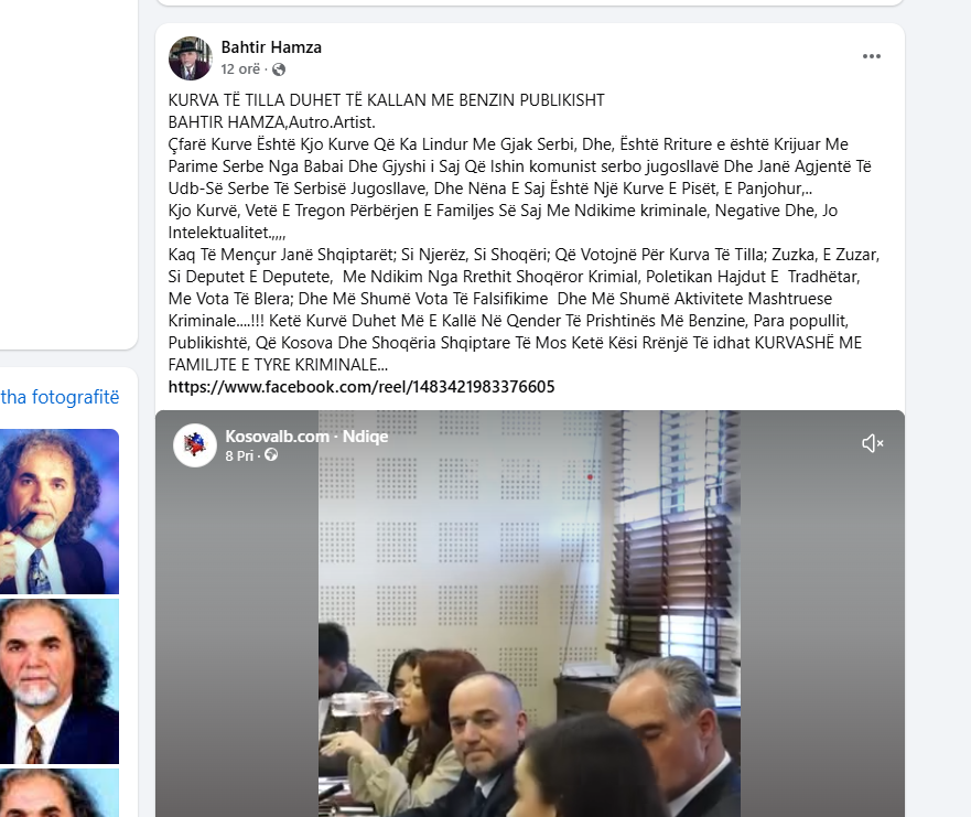 Çfarë Kurve Është Kjo Kurve Që Ka Lindur Me Gjak Serbi, Dhe, Është Rriture e është Krijuar Me Parime Serbe Nga Babai Dhe Gjyshi i Saj Që Ishin komunist serbo jugosllavë Dhe Janë Agjentë Të Udb-Së Serbe Të Serbisë Jugosllave, Dhe Nëna E Saj Është Një Kurve E Pisët, E Panjohur,.. Kjo Kurvë, Vetë E Tregon Përbërjen E Familjes Së Saj Me Ndikime kriminale, Negative Dhe, Jo Intelektualitet”, ka shkruar ai.