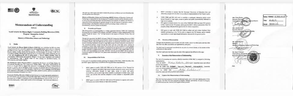 Bazuar në dokumentacionin zyrtar të siguruar dhe analizën e përmbajtjes së Memorandumit të Mirëkuptimit të nënshkruar ndërmjet Ministrisë së Arsimit, Shkencës dhe Teknologjisë (MASHT), organizatës Youth Initiative for Human Rights – Kosovo (YIHR KS), Community Building Mitrovica (CBM) dhe programit “Demand for Justice” (D4J), si qytetar me përgjegjësi personale e publike, parashtroj kërkesë publike dhe institucionale për revokimin dhe shfuqizimin e menjëhershëm të kësaj marrëveshjeje.