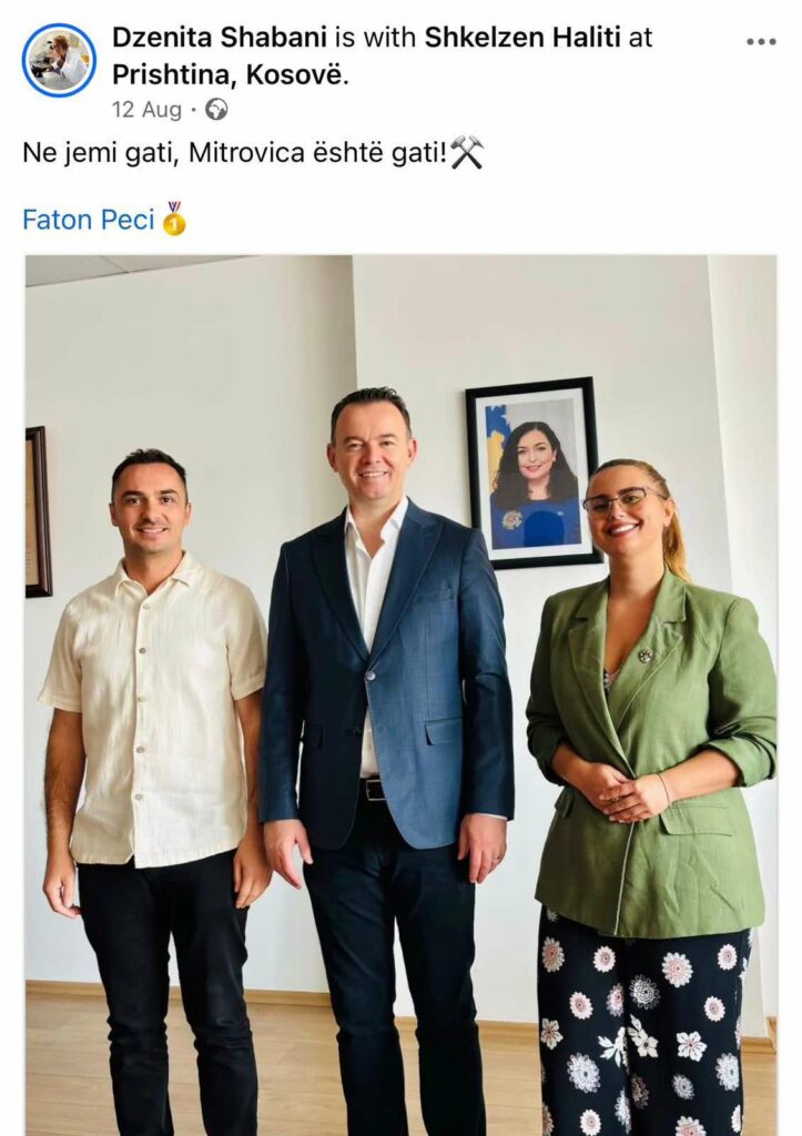 Në profilin e saj në Facebook, Shabani ka postuar një fotografi ku ajo haptazi i jep përkrahje Faton Pecit edhe në garën për Mitrovicën, në një fotografi ku duket me Faton Pecin si dhe këshilltarin tjetër Shkëlzen Haliti, me mbishkrimin “ne jemi gati, Mitrovica është gati”.