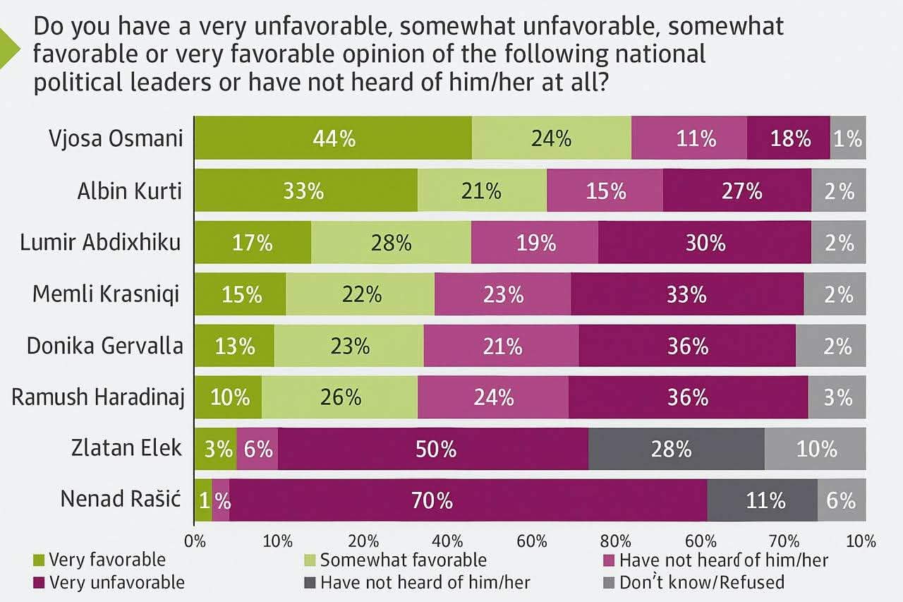 Kryeministri në detyrë, Albin Kurti, renditet i dyti me 51% vlerësime të favorshme, ndërsa udhëheqësit e partive kryesore opozitare paraqiten me rezultate më të përziera.