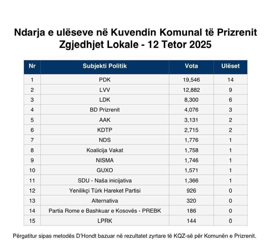 Kështu ndahen mandatet në Kuvendin e Prizrenit