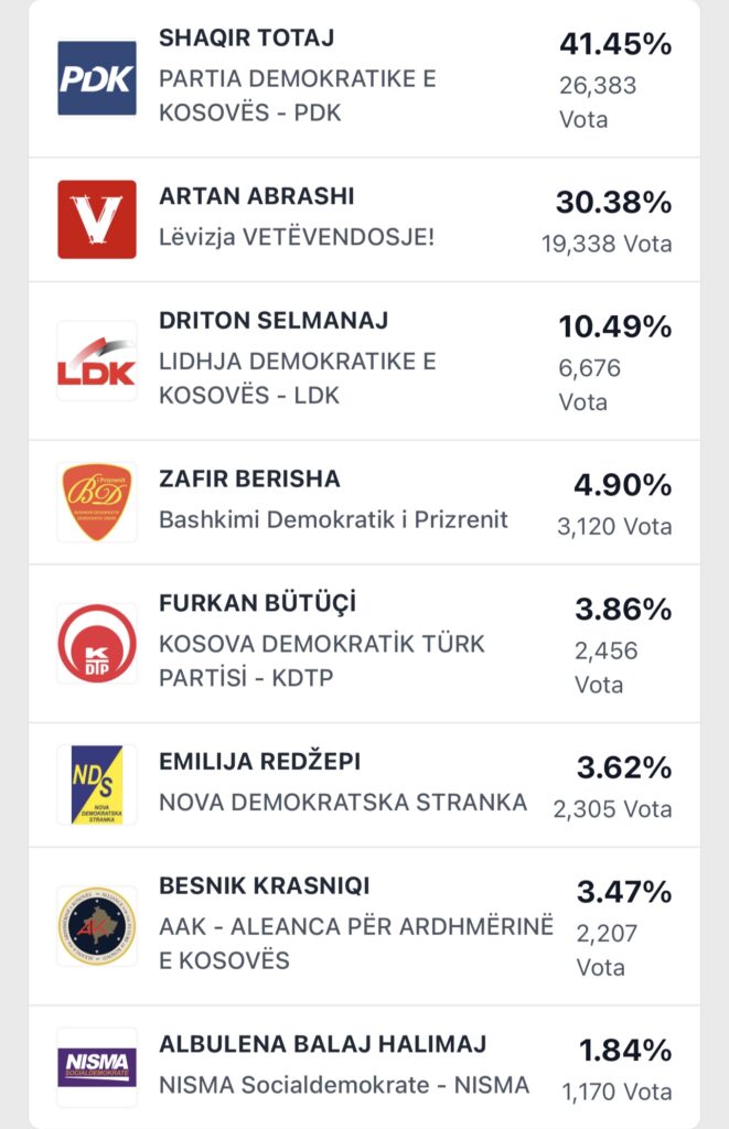Ndërkohë, gara për kryetar të komunës do të vendoset në balotazh më 9 nëntor, ku do të përballen Shaqir Totaj nga PDK dhe Artan Abrashi nga Vetëvendosje. Totaj kryeson me 26,383 vota, ndërsa Abrashi ka marrë 19,338, me një diferencë prej rreth 7 mijë votash.