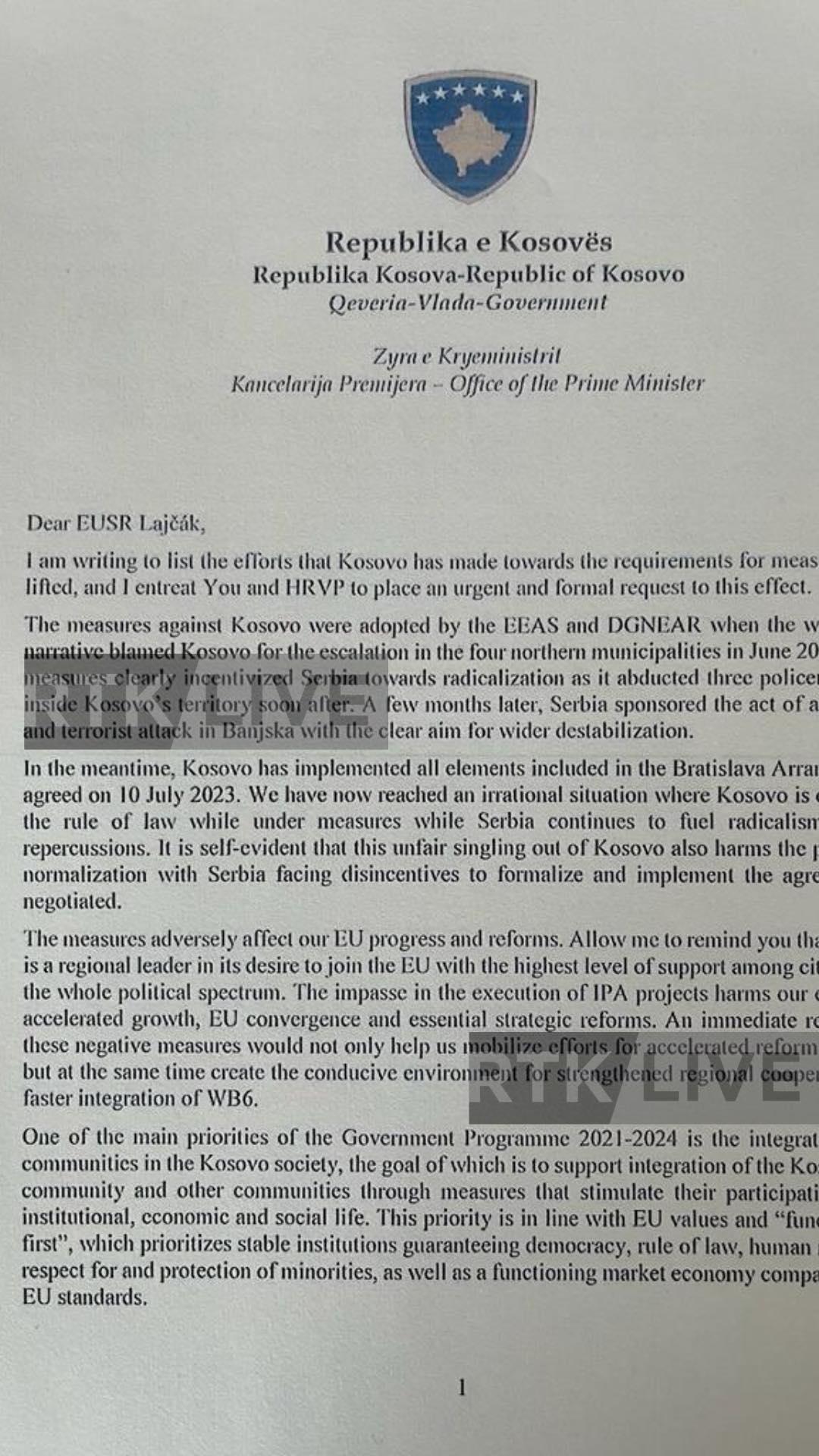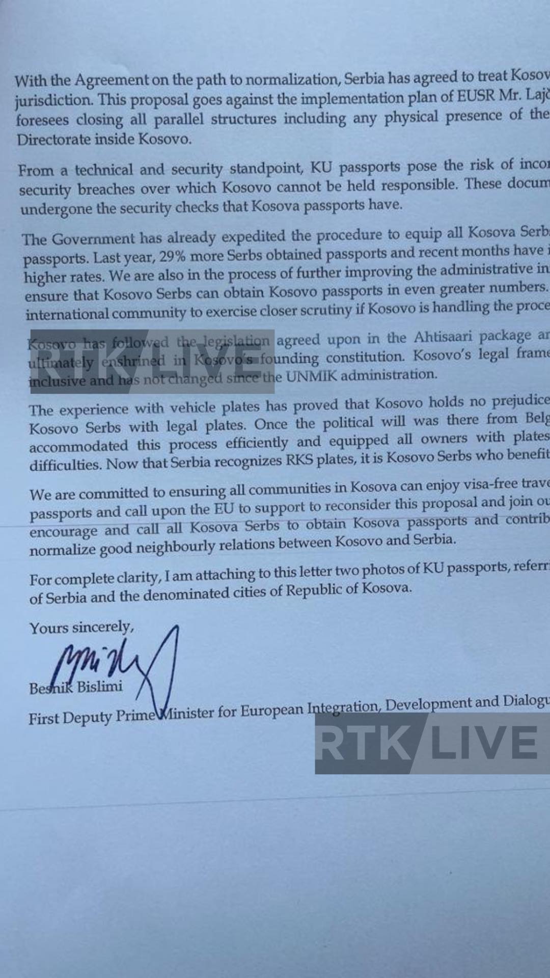 Kurti ka thënë se janë të përkushtuar që të sigurojnë që të gjitha komunitetet në Kosovë të mund të gëzojnë udhëtimin pa viza me pasaportat e Kosovës dhe përmes dokumenteve të paraqitura i ka bërë thirrje BE-së që të mbështesë rishqyrtimin e propozimit për liberalizimin e vizave edhe për qytetarët serbë të Kosovës me pasaporta të Serbisë, duke i bërë thirrje BE-së që t’i bashkohet fushatës së Qeverisë së Kosovës për të inkurajuar dhe thirrur të gjithë serbët e Kosovës që të marrin pasaportat e Kosovës dhe të kontribuojnë në normalizimin e mëtejshëm dhe marrëdhënies së mirë fqinjësore ndërmjet Kosovës dhe Serbisë.