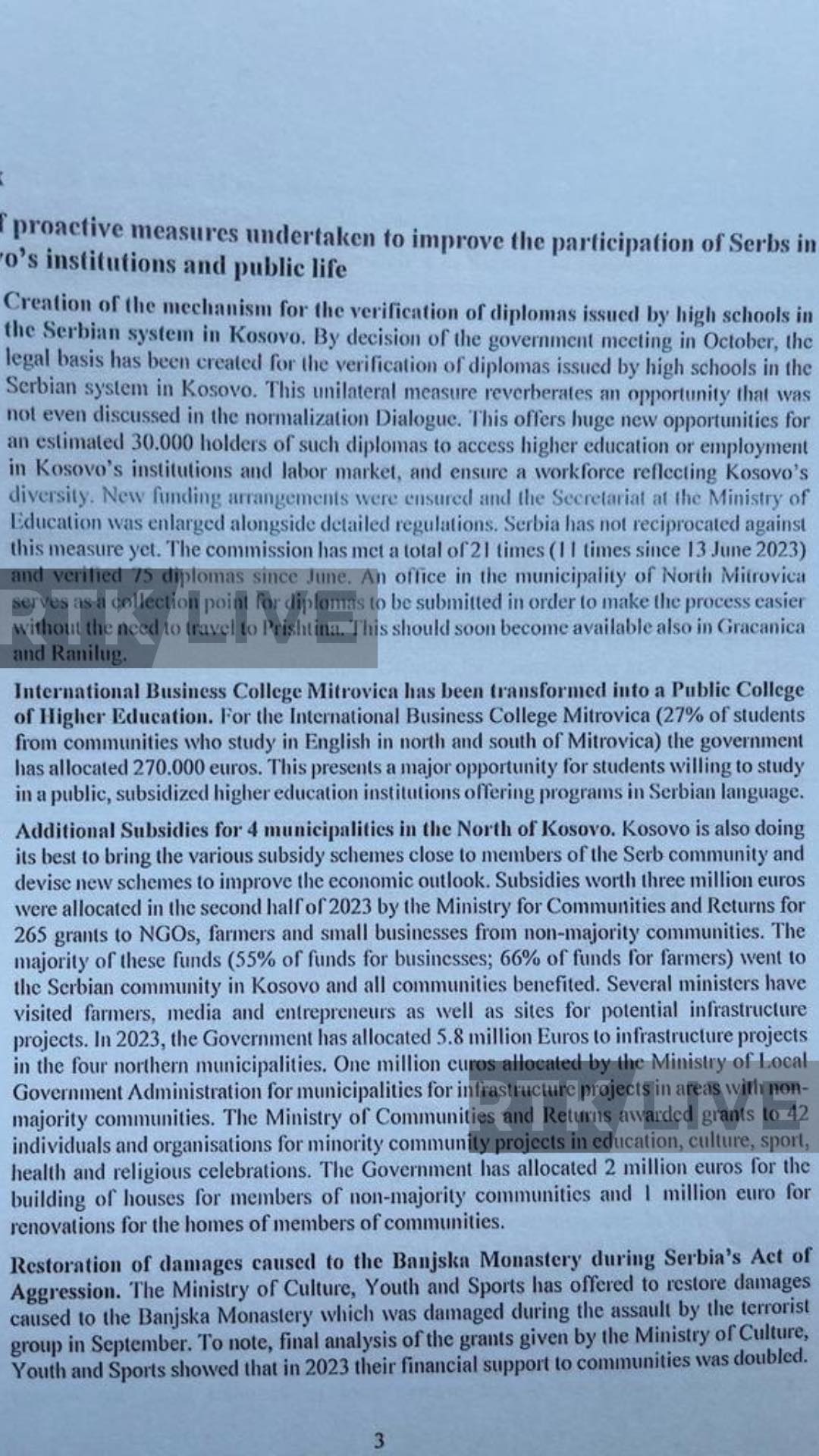 Në këto dokumente është prezantuar edhe lista e masave proaktive të ndërmarra për të përmirësuar pjesëmarrjen e serbëve në institucionet dhe jetën publike të Kosovës.