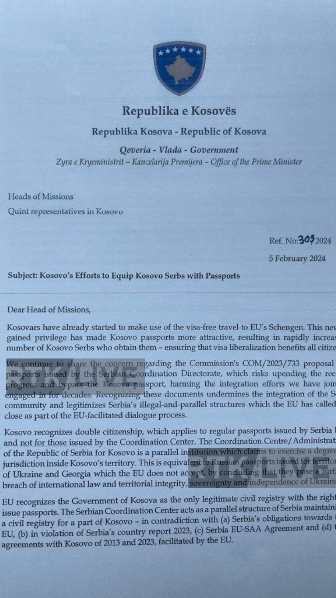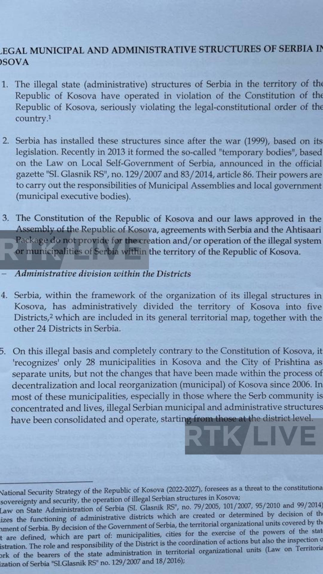 Në dokumentet e siguruara nga RTKlive, të cilat i pari i ekzekutivit ua ka dorëzuar ambasadorëve, ai ka prezantuar funksionimin e strukturave ilegale të Serbisë brenda Kosovës, e të cilat e cenojnë rëndë rendin juridiko-kushtetues të Republikës së Kosovës. Kryeministri ua ka bërë të qartë ambasadorëve se Kushtetuta e Republikës së Kosovës dhe ligjet e miratuara në Kuvendin e Republikës së Kosovës, marrëveshjet me Serbinë dhe Pakoja e Ahtisaarit nuk parashikojnë krijimin ose funksionimin e sistemit ilegal apo komunave të Serbisë brenda territorit të Republikës së Kosovës. Ai ka thënë se këto struktura, të cilat ofrojnë shërbime ilegale për qytetarët e komunitetit serb, janë pengesë për integrimin e këtij komuniteti në sistemin e Republikës së Kosovës.