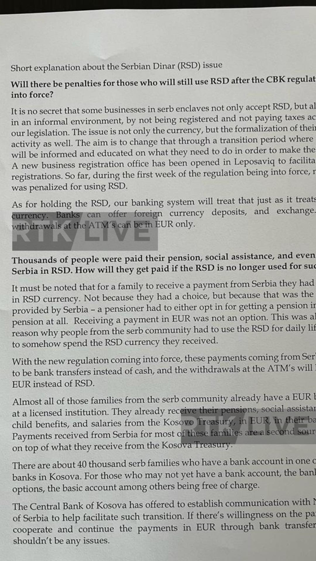 Sa i përket çështjes së ndalimit të dinarit, kryeministri Kurti ka paraqitur dokumente në të cilat dokumentohet se qytetarët e komunitetit serb tashmë kanë një llogari bankare në euro në një institucion të licencuar, pasi ata tashmë i marrin pensionet, pagesën e asistencës sociale, përfitimet e fëmijëve dhe pagat nga Thesari i Kosovës, në euro, në llogaritë e tyre bankare. Sipas kreut të Qeverisë, pagesat e marra nga Serbia për shumicën e këtyre familjeve janë burimi i dytë i të ardhurave, krahas asaj që marrin nga Thesari i Kosovës.