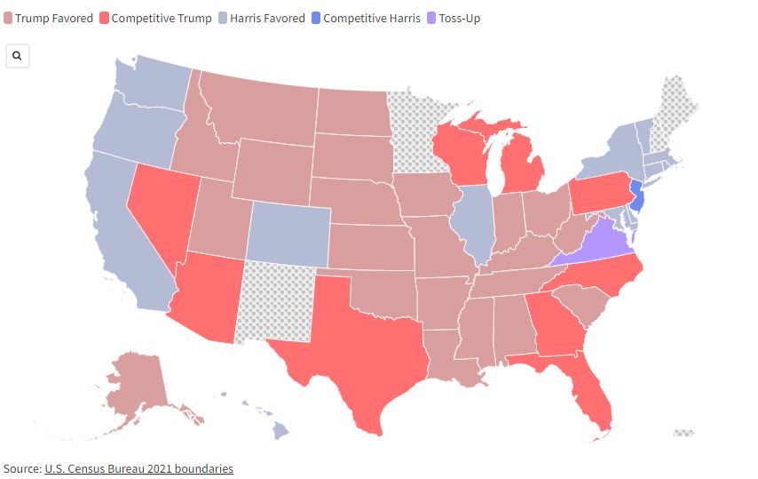 Katër shtete potencialisht konkurruese – Maine, Minesota, New Hampshire dhe New Mexico – nuk kanë mjaft sondazhe të kohëve të fundit për të thënë nëse Harris ose Trump janë të favorizuar në këtë pikë, megjithëse demokratët përgjithësisht shihen si të preferuar në ato shtete.