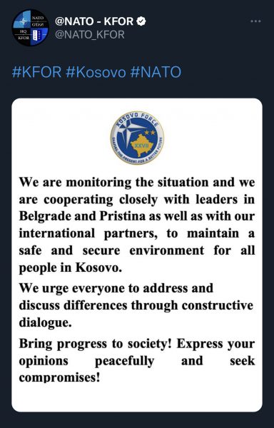 “Ne i bëjmë thirrje të gjithëve që të adresojnë dhe diskutojnë dallimet përmes dialogut konstruktiv. Sillni përparim në shoqëri! Shprehni mendimet tuaja në mënyrë paqësore dhe kërkoni kompromise!”, thuhet në deklaratën e lëshuar nga KFOR-i.