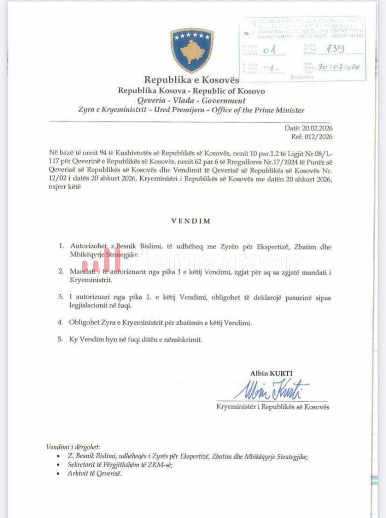 Dokumenti, i nënshkruar nga Kurti më 20 shkurt 2026, detyron gjithashtu Zyrën e Kryeministrit të zbatojë këtë vendim, i cili hyn në fuqi menjëherë pas nënshkrimit.
