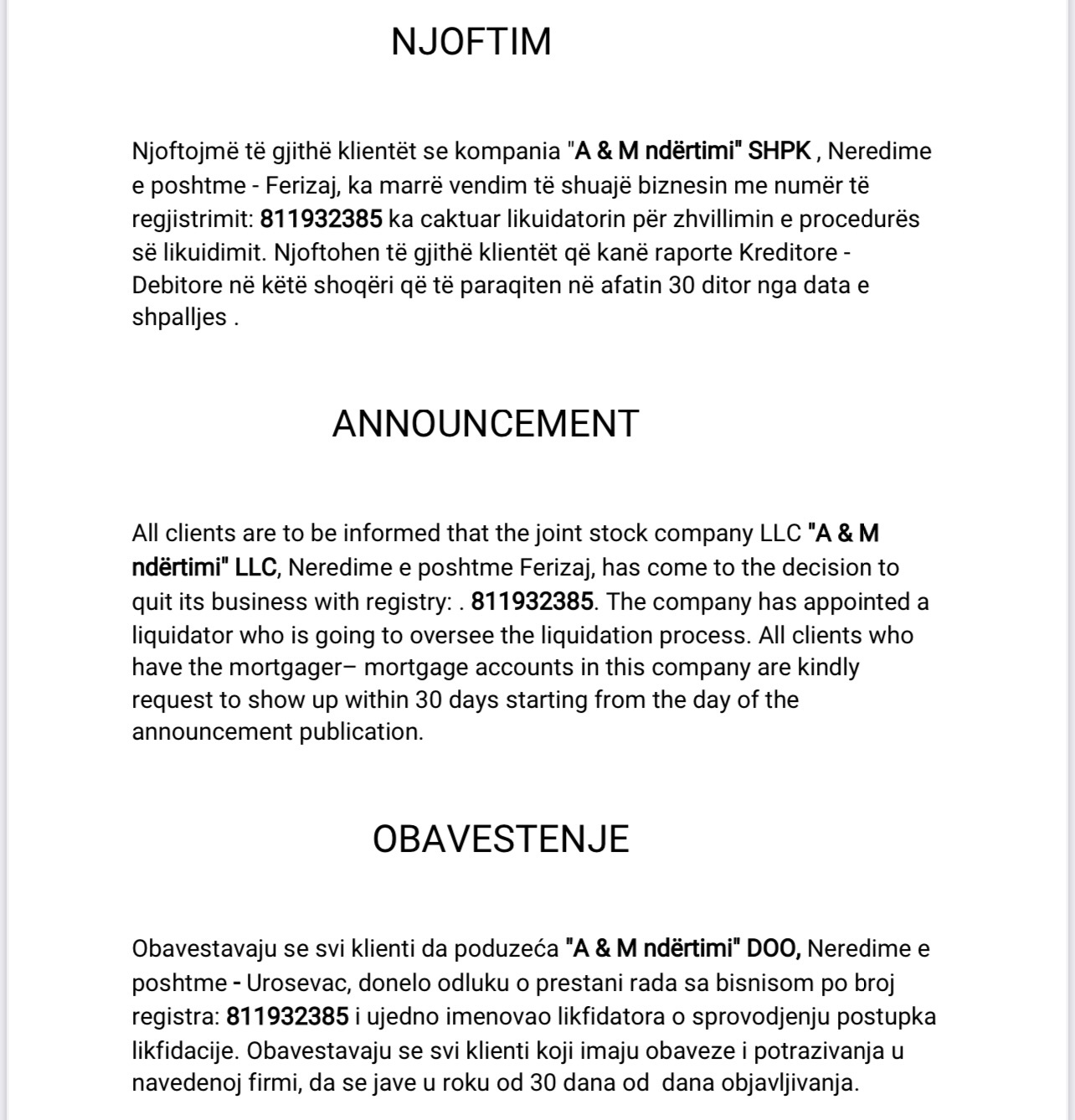 Kompania “A & M ndërtimi” – likuidim, 17.10.2023 17 tetor 2023 | 15:39 Lajme të sponsorizuara Të Fundit 23 tetor16:50 Shpallje e pavlefshme nga Bleranda Çitaku 23 tetor16:48 Shpallje e pavlefshme nga N.T.P “OPOJA” 23 tetor15:28 Debat Publik nga Kompania “Albi Shopping” 23 tetor15:25 Debat Publik nga Kompania “Albi Shopping” 23 tetor15:22 Debat Publik nga Kompania “Albi Shopping” 23 tetor15:14 Shpallje e pavlefshme nga Benjamin Rrukaj