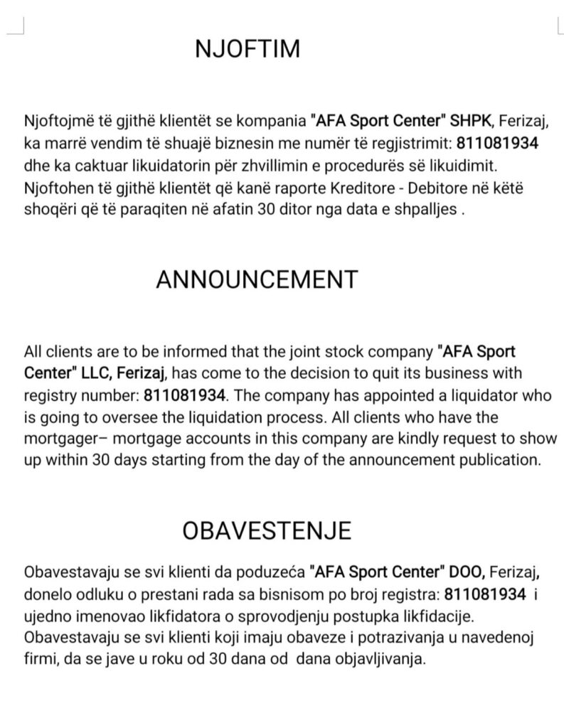 Kompania “AFA Sport Center” – likuidim, 26.02.2026 26 shkurt 2026 | 12:21 Lajme të sponsorizuara Të Fundit 26 shkurt12:25 “Elite Construction Group” – njoftim për zvogëlim kapitali, 26.02.2026 26 shkurt12:21 Kompania “AFA Sport Center” – likuidim, 26.02.2026 26 shkurt11:28 Shpallje nga Kristina Skender Kolgjeraj 26 shkurt09:59 Shpallje e pavlefshme nga Gafurr Elshani B.I 25 shkurt16:19 Shpallje nga Flamurtar Ukaj B.I. 25 shkurt12:58 Shpallje e pavlefshme nga N.T.SH. “Rubikon”