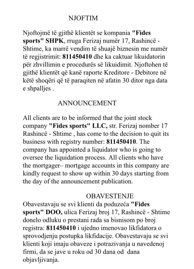 Kompania “Fides sports” – likuidim, 17.05.2023 17 maj 2024 | 17:45 Lajme të sponsorizuara Të Fundit 20 tetor16:35 Shpallje e pavlefshme nga Isan Šerifi B.I 20 tetor15:27 Shpallje e pavlefshme nga Agim Osmanaj 20 tetor11:14 Shpallje e pavlefshme nga Shigjeta Shkodra 20 tetor10:17 Shpallje e pavlefshme nga Erisa Peci 18 tetor23:08 Shpallje e pavlefshme nga Nepe Krasniqi 18 tetor23:04 Shpallje e pavlefshme nga Blina Kryeziu
