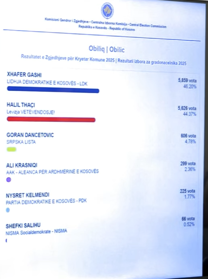 Komuna e Obiliqit do të shkojë në raundin e dytë, ku Xhafer Gashi nga Lidhja Demokratike e Kosovës ka marrë 5 mijë e 859 vota apo 46%, ndërsa Halil Thaçi nga Lëvizja Vetëvendosje ka marrë 5 mijë e 626 vota apo 44.37%.