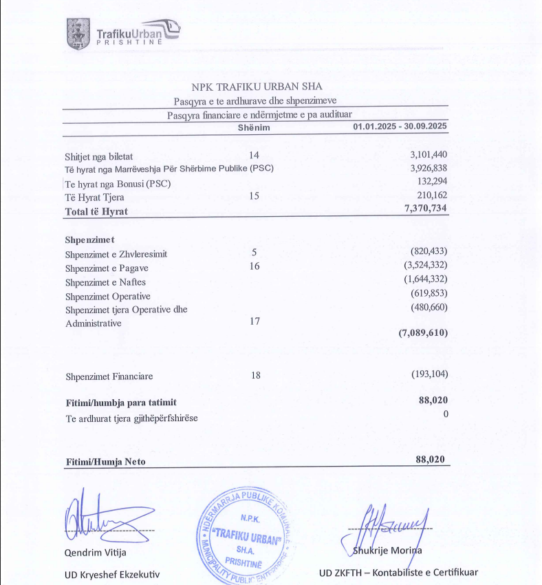 Në përgjigje të interesimit të vazhdueshëm tuajin lidhur me performancën financiare të ndërmarrjes, ju informojmë se NPK Trafiku Urban SHA vazhdon të operojë me bilanc pozitiv dhe me stabilitet të qëndrueshëm financiar. Gjatë nëntëmujorit të vitit 2025, rezultatet financiare janë si në vijim: