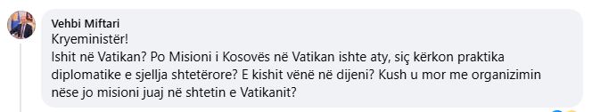 “Kryeministër! Ishit në Vatikan? Po Misioni i Kosovës në Vatikan, a ishte aty, ashtu siç e kërkon praktika diplomatike dhe sjellja shtetërore? A e kishit vënë në dijeni? Kush u mor me organizimin, nëse jo misioni juaj në shtetin e Vatikanit?”, ka shkruar Miftari.