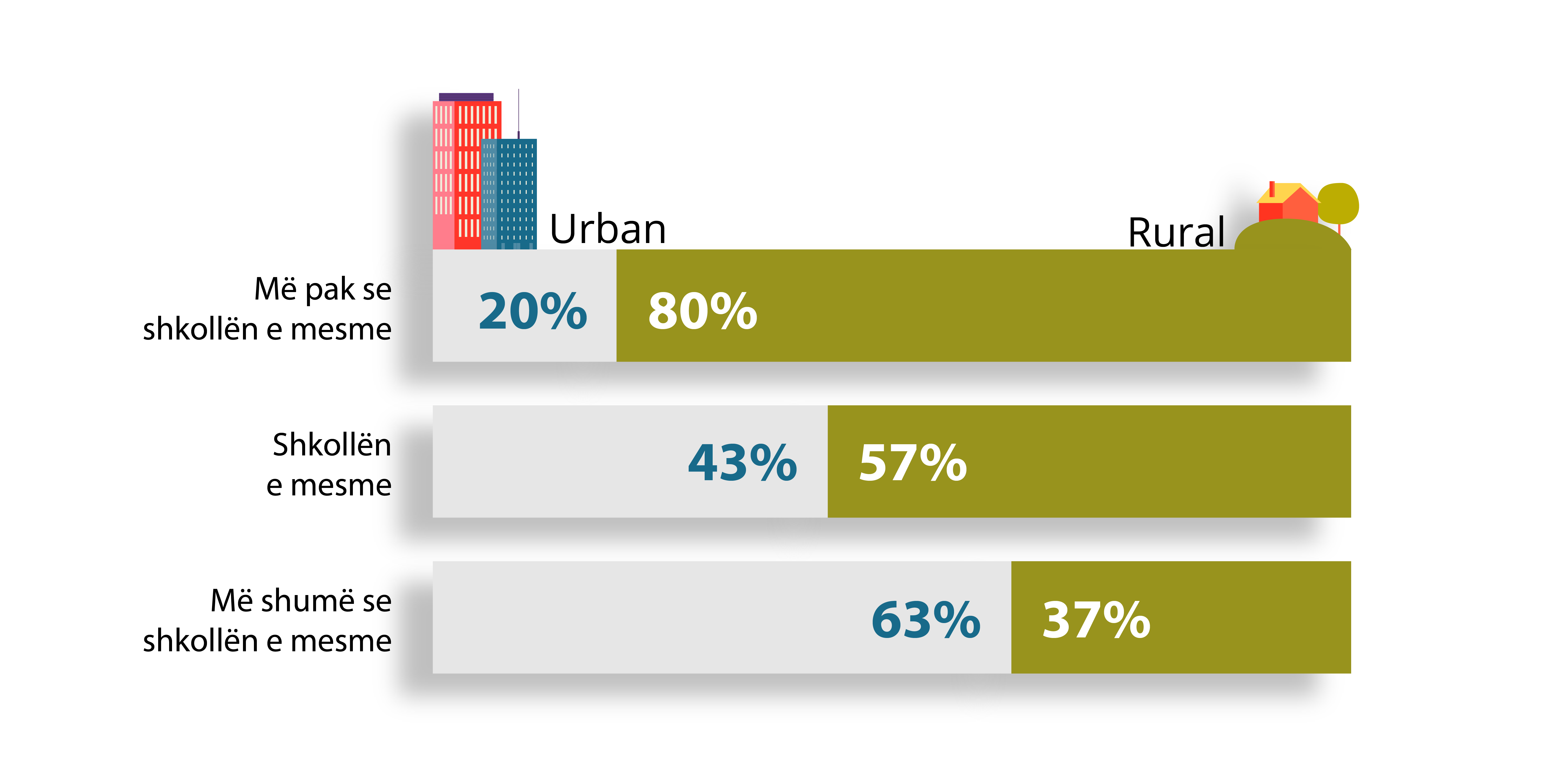 Kjo është e dukshme edhe për nga aspekti i vendbanimit, ku 80% e përdoruesve që kanë nivel të ulët të arsimit jetojnë në vendet rurale, derisa përqindja e përdoruesve që jetojnë në vendet urbane rritet paralel me nivelin e arsimit.