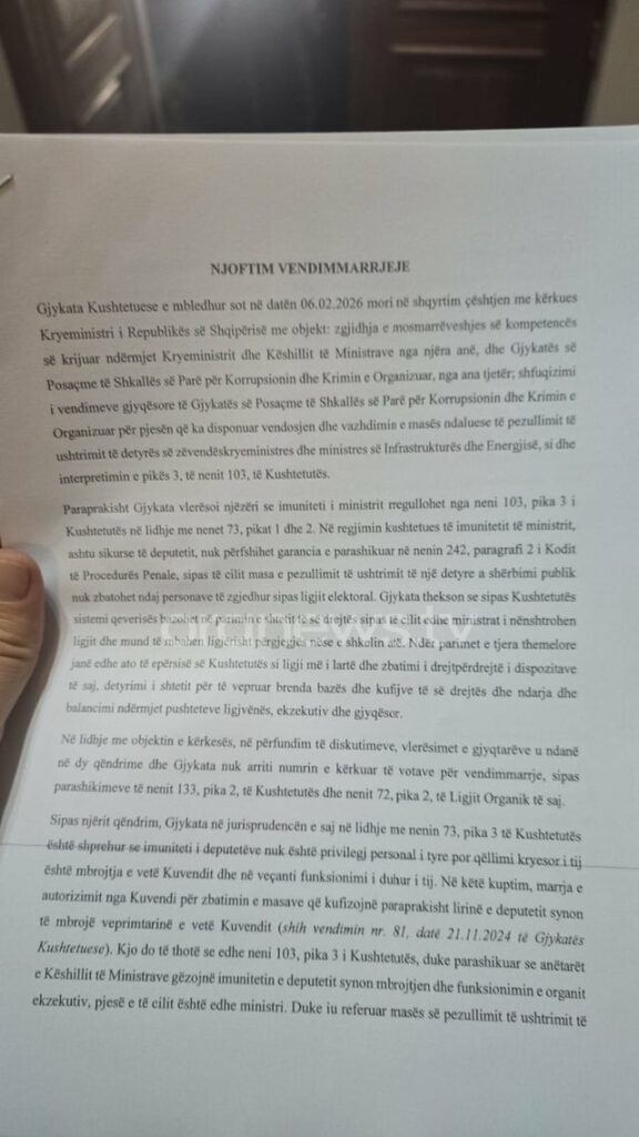Gjykata Kushtuese është mbledhur sërish ditën e sotme në lidhje me përplasjen institucionale mbi kompetencat mes qeverisë dhe Gjykatës së Posaçme, që lidhet me vendimin për pezullimin nga detyra të zëvendëskryeministres Belinda Balluku.
