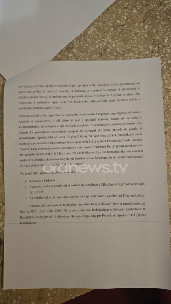 Dhe pas afro 10 orësh shqyrtim, Kushtetuesja ka rrëzuar kërkesën e Qeverisë, duke lënë në fuqi pezulimin e Ballukut nga detyra e Zëvendëskryeministres dhe Ministres.