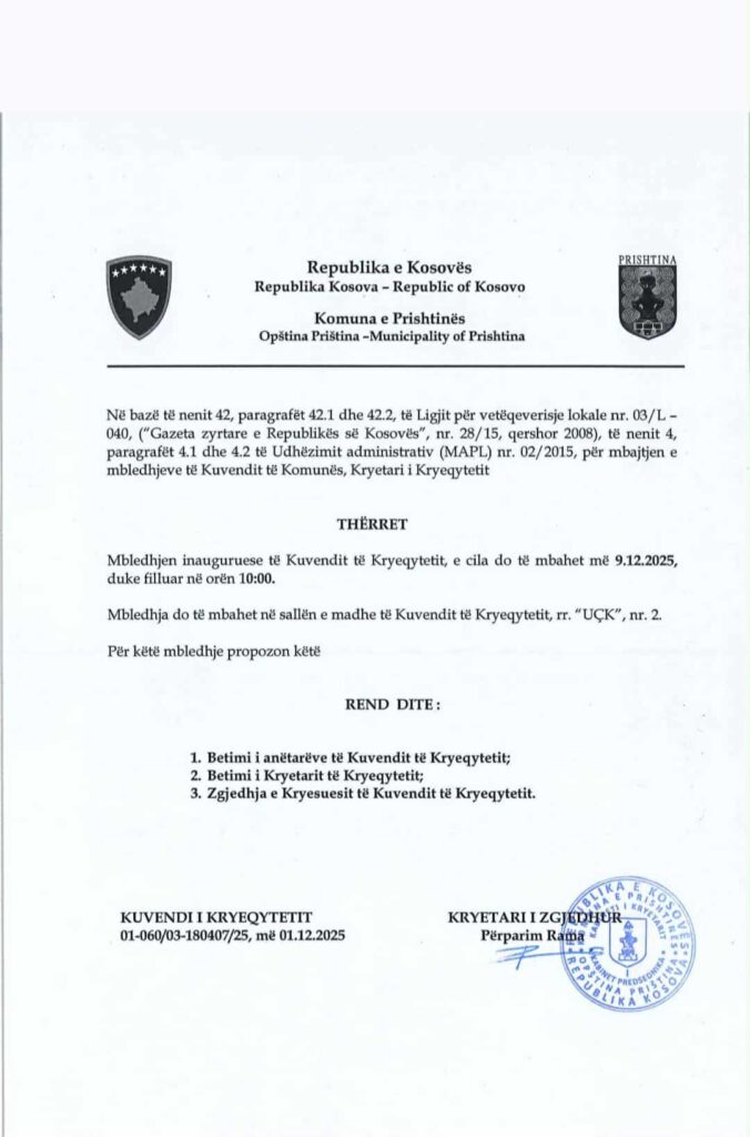 Kuvendi Komunal i Prishtinës do të zhvillojë me datën 9 dhjetor mbledhjen inauguruese, duke filluar nga ora 10:00. Kryetari i zgjedhur i Prishtinës, Përparim Rama, ka caktuar mbledhjen inauguruese të Kuvendit të Kryeqytetit, që do të zhvillohet më 9 dhjetor 2025, duke filluar nga ora 10:00, në sallën e madhe të Kuvendit.