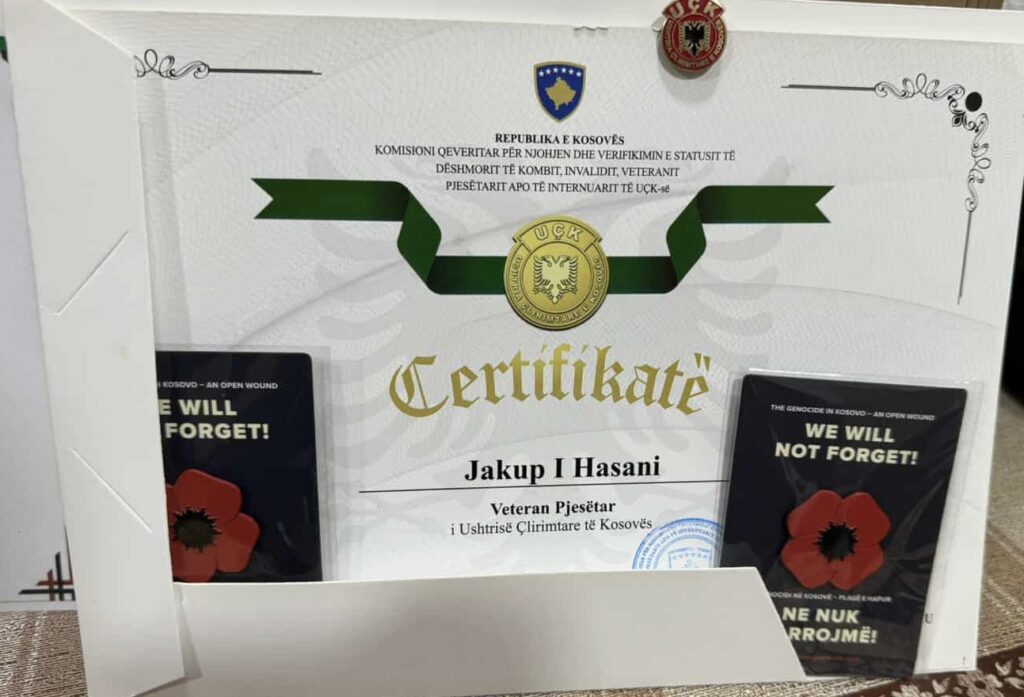 Po ashtu, Agush Buja ia ka dorëzuar bashkëshortes së tij, Lirije Hasani, edhe Certifikatën e Veteranit, me të cilën Jakup Hasani nderohet si pjesëtar i Ushtrisë Çlirimtare të Kosovës (UÇK).